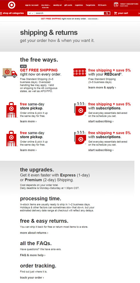 Target’s offer made headlines because it seemed, well, special. The media firestorm it generated is a public relations dream and customer service nightmare. The takeaway provided in sound bites and on the company’s home page is “Free shipping on every order.” They fail to mention the asterisk: