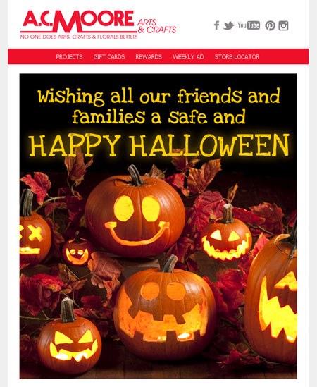 Companies have to make sales to survive. Marketers charged with delivering revenue try to squeeze every possible cent out of subscribers before the clock strikes midnight on the seasonal opportunity. Deeper discounts and last minute offers are standard operating procedure. In an inbox filled with messages screaming “sale” and “buy now before it’s too late,” A.C. Moore’s Halloween email was a breath of fresh air.