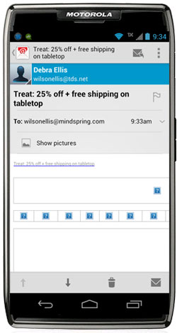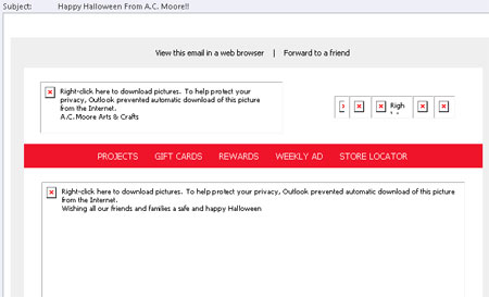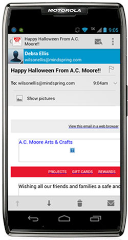 There is very little incentive for people to download the images to see the offer. A.C. Moore does a much better job of tagging the images. The following images show the message without images as viewed on a desktop and smartphone: