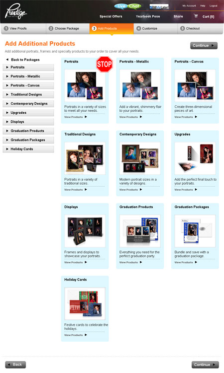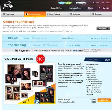 What are points? How do I use them? What does each one cost? The copy, “Select any combination and quantity of portraits and products to redeem your points,” doesn’t answer the questions. Perhaps it would be better to order individual items. Clicking on the Add Products tab opens another page with a stop sign.