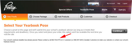 In fine print it tells me “Your school’s yearbook deadline has already passed. Please contact us at 800-736-4775 (U.S. Customers) or 866-557-9254 (Canadian Customers) to make your selection or contact your school’s Yearbook Advisor.”